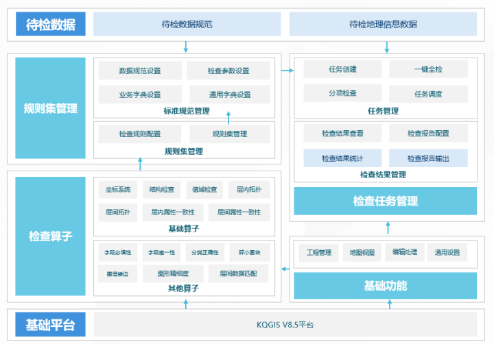 蒼穹地理信息數(shù)據(jù)質(zhì)量檢查系統(tǒng)基于KQGIS平臺自主研發(fā),旨在對各類二三維地理信息數(shù)據(jù)進行高效準(zhǔn)確的質(zhì)檢?;诓粩喔M二調(diào)、三調(diào)和持續(xù)十多年的變更調(diào)查服務(wù),以及持續(xù)支撐國土空間規(guī)劃、實景三維等強GIS應(yīng)用,積累形成豐富的空間、屬性檢查算子,面向各類地理信息數(shù)據(jù)規(guī)范化質(zhì)量檢查要求,實現(xiàn)基于算子的檢查規(guī)則靈活配置與規(guī)則集構(gòu)建管理,對二三維地理信息數(shù)據(jù)進行高效檢查和結(jié)果輸出。