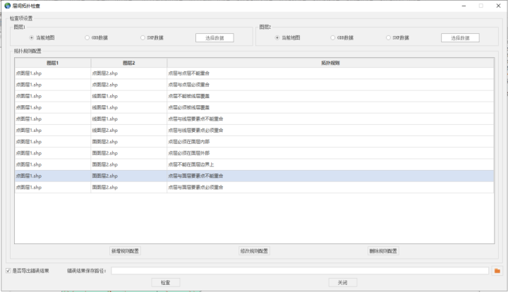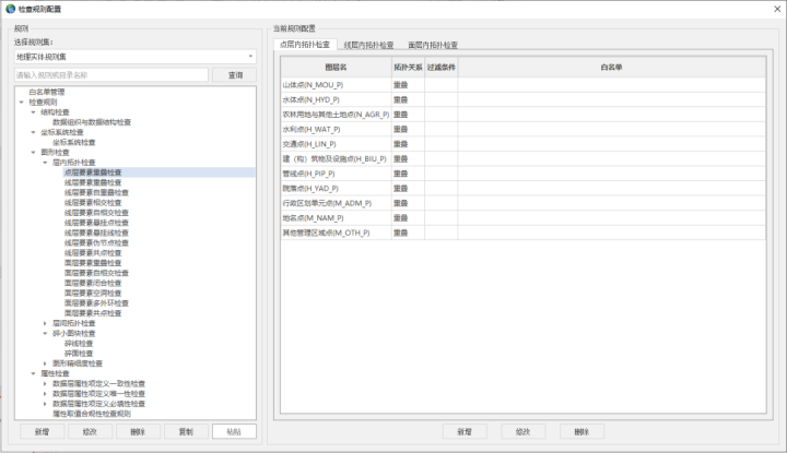 針對具體的數(shù)據(jù)檢查項目,基于系統(tǒng)提供的檢查算子,結(jié)合不同的數(shù)據(jù)規(guī)范要求,形成檢查規(guī)則集:一方面可按照數(shù)據(jù)規(guī)范明確的內(nèi)容進行配置,另一方面可結(jié)合地方特色進行本地化的規(guī)則細項配置,自由組裝形成對應(yīng)的檢查規(guī)則,滿足不同業(yè)務(wù)場景及本地化需求的地理信息數(shù)據(jù)質(zhì)量核查要求。