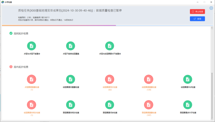 系統(tǒng)提供交互式質(zhì)檢能力,賦予用戶更加直觀、高效的質(zhì)檢體驗,支持對質(zhì)檢全過程的監(jiān)控與調(diào)度,允許用戶在質(zhì)檢進行中隨時暫?;蛑貑?,即時查看當(dāng)前的質(zhì)檢情況,確保隨控隨檢、無遺漏。同時采用圖屬聯(lián)動的方式,對質(zhì)檢結(jié)果進行可視化定位以及以質(zhì)檢報告形式導(dǎo)出,實現(xiàn)質(zhì)檢全流程數(shù)據(jù)的可回溯。