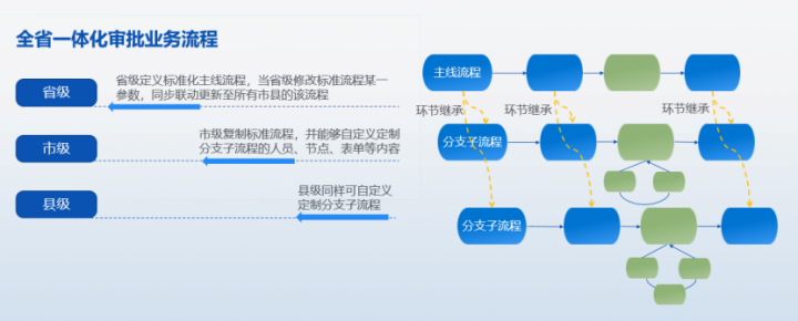 針對市縣組卷審查效率低下、省級層面又難以實施全面監(jiān)管等突出問題,江蘇省用途管制一體化審批系統(tǒng)采用新一代工作流框架,引入業(yè)務(wù)流程分級授權(quán)技術(shù),實現(xiàn)省、市、縣多級業(yè)務(wù)一體化線上辦理、聯(lián)動審批與信息回流,顯著提升全省用地項目審批的規(guī)范性與時效性。在業(yè)務(wù)規(guī)范方面兼顧全省統(tǒng)籌與地方特色,支持省級層面定義從市縣級勘測定界、組卷、初審、到省級審查的標(biāo)準(zhǔn)化主線流程,各設(shè)區(qū)市協(xié)辦處室可根據(jù)本地實際情況個性化定制分支子流程節(jié)點與表單,保障全省一體化標(biāo)準(zhǔn)下,地方特色業(yè)務(wù)辦理需求也能得到充分支持;在辦件效率方面強化省廳監(jiān)管,支持對各環(huán)節(jié)辦理時限提醒與限制,以全流程線上辦理落實省廳全程跟蹤監(jiān)控。