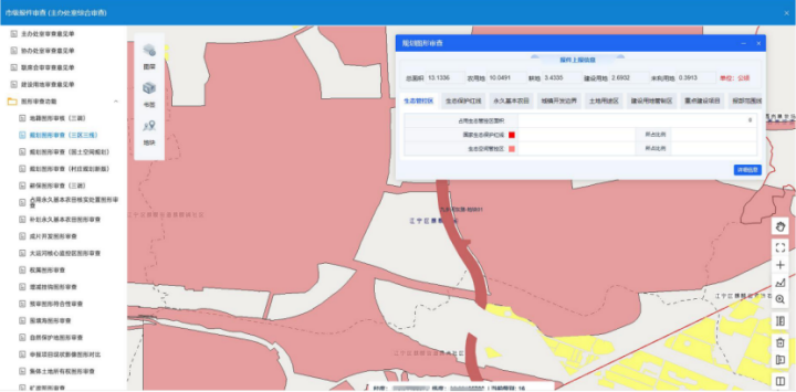 針對項目申報多補正、有退件的問題,沿用江蘇省建設(shè)用地審批系統(tǒng)中的帶圖審批能力,省市縣三級部門依托統(tǒng)一的底圖開展業(yè)務(wù)審批工作,并將一鍵圖審功能、業(yè)務(wù)審查功能前置至縣、區(qū)組卷階段,實現(xiàn)在報件組卷環(huán)節(jié)即可分析審查報批地塊是否存在規(guī)劃沖突、占用生態(tài)管控空間、占用永久基本農(nóng)田等問題,通過技術(shù)性輔助審查前置減少后續(xù)補正、退件的耗時。并同步建立圖形審查結(jié)果緩存機制,系統(tǒng)自動存儲管理前序?qū)徍谁h(huán)節(jié)的圖形審查結(jié)果,當(dāng)流轉(zhuǎn)到后續(xù)廳局領(lǐng)導(dǎo)審核節(jié)點時可直接調(diào)取前序圖審結(jié)果,無需重復(fù)分析,從而提升審批效率。