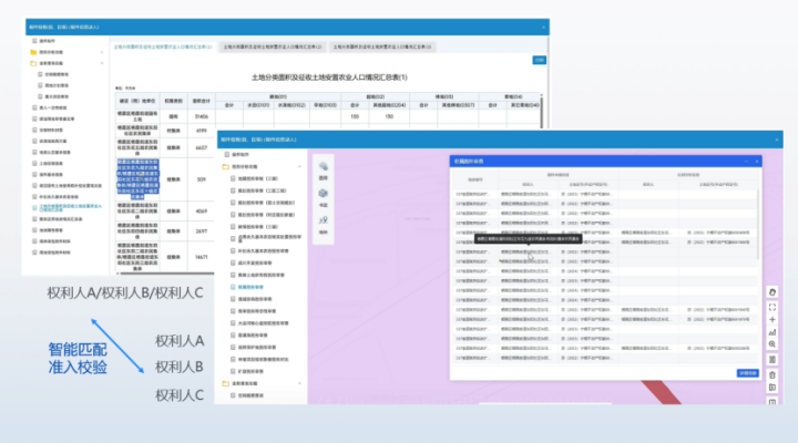 同時提供準(zhǔn)入一體化核驗功能進一步減少補正、退件問題,通過構(gòu)建準(zhǔn)入審查分析規(guī)則,強化對報件數(shù)據(jù)格式規(guī)范、部用途管制監(jiān)管規(guī)范、省廳業(yè)務(wù)準(zhǔn)入規(guī)范、空間準(zhǔn)入規(guī)范四個層面的一體化核驗,保障所有業(yè)務(wù)要素、技術(shù)指標(biāo)嚴(yán)格契合部、省兩級審批標(biāo)準(zhǔn),有力確保部用途管制監(jiān)管通過率達到100%。為提升準(zhǔn)入核驗的精準(zhǔn)度與智能化水平,引入DeepSeek大模型,借助其強大的知識圖譜構(gòu)建與語義理解分析能力,實現(xiàn)用地審批中被征(用)地單位權(quán)屬名稱與不動產(chǎn)權(quán)利人名稱的智能比對核驗,規(guī)避因命名邏輯不一致而導(dǎo)致的準(zhǔn)入判斷錯誤問題。